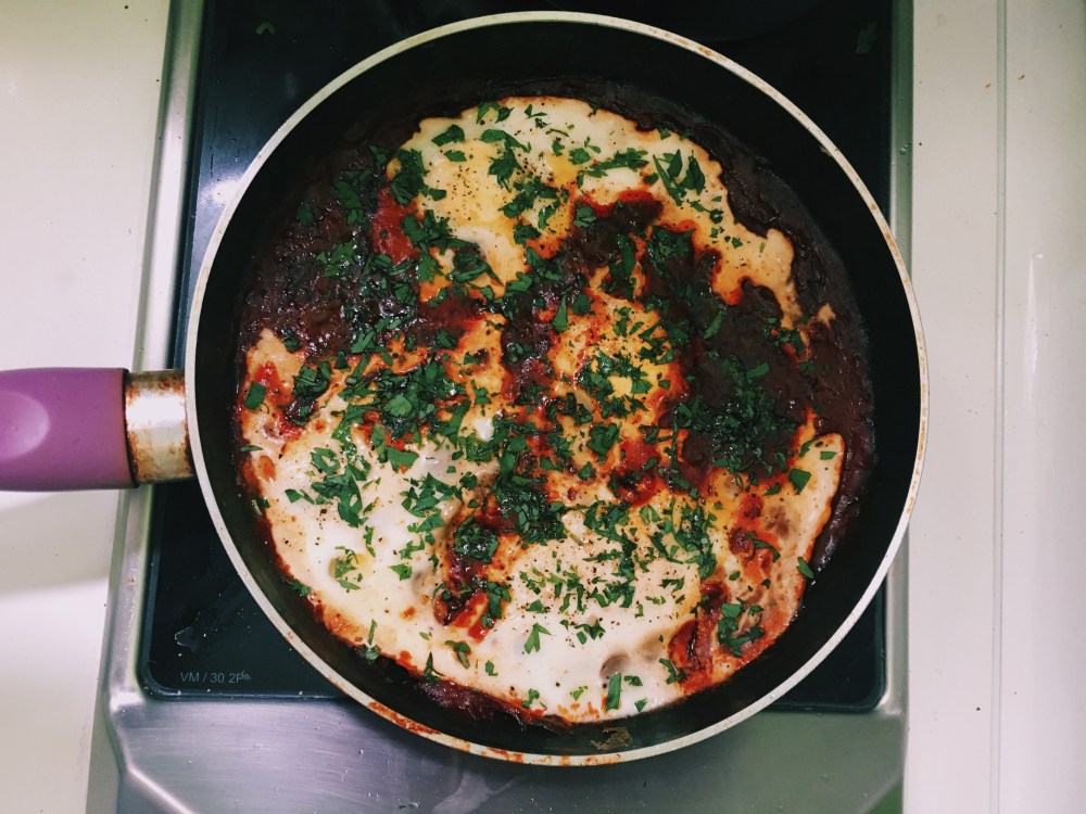 This dish contains: eggs, tomatoes, pepper, onion, garlic, olive oil, chili pepper, parsley, cumin.